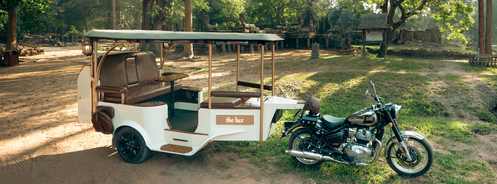 ENJOYThe exclusive experience of The Lux handcrafted tuk-tuk offers a truly luxurious and comfortable ride. Handcrafted in Siem Reap by Khmer craftsmen, “the lux” Tuk Tuk is features a royal appointment of unique design, a comfortable sofa, bar and a refreshment table.